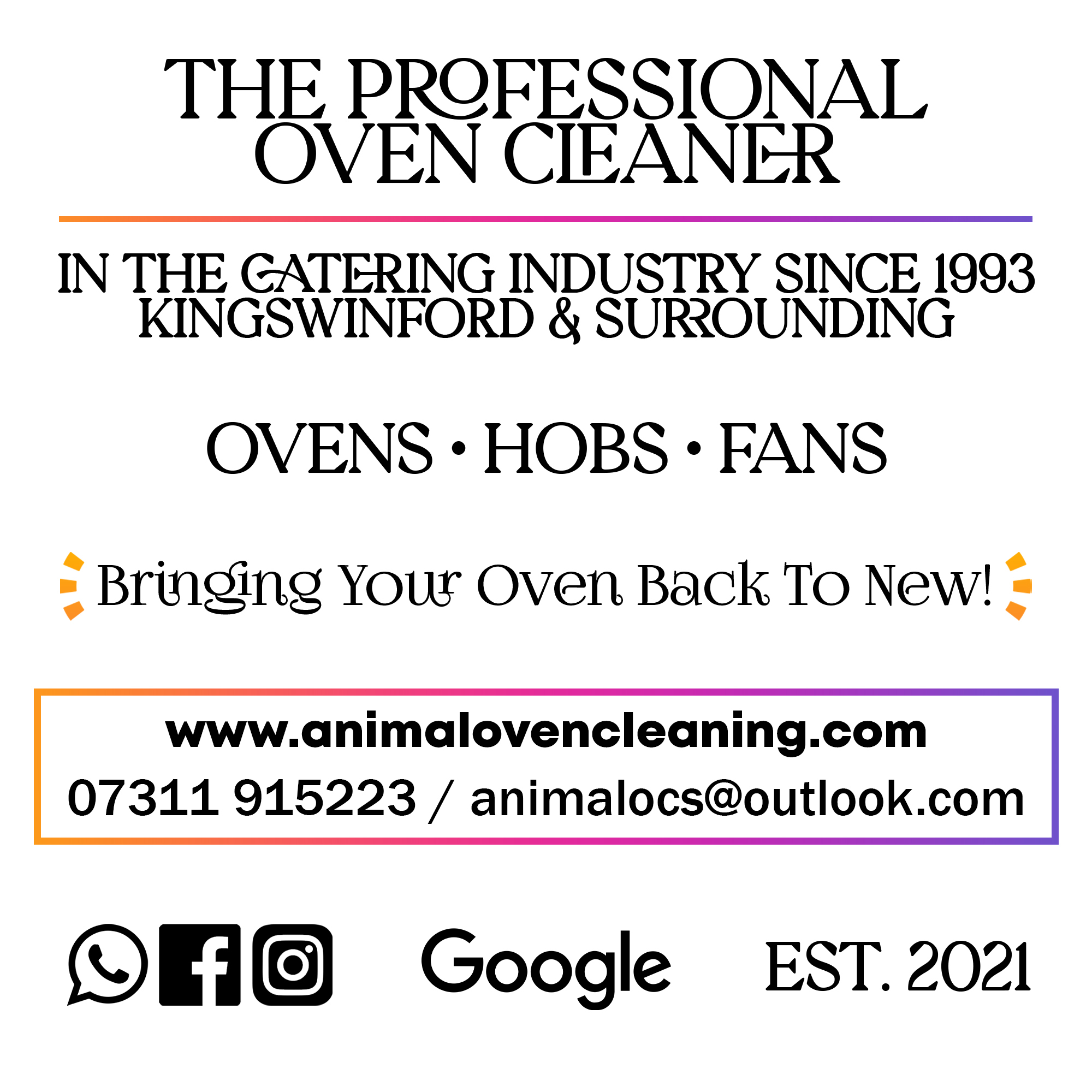 “Animal” has been my nickname since I was a kid – thanks to my love of drumming – and it’s now the name behind a business I’m proud of. I enjoy meeting new customers, restoring their ovens, and leaving them with a sparkling kitchen and a smile.